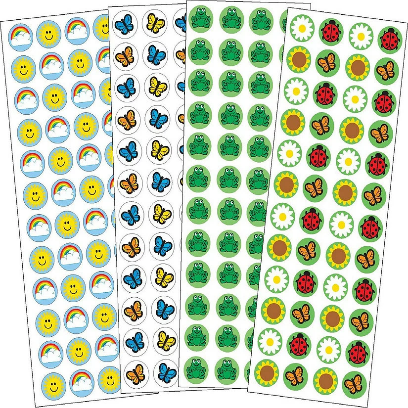 Spring Sticker Set has 4 assorted sheets of 288 stickers. Approx. 3/8″ each. Set includes: SE-2507 Butterfly, SE-2520 Rainbow Sun, SE-2511 Daisy/Bug, and SE-2510 Frogs. Great for use with our incentive charts. Great for tracking goals, scrapbooking and other creative uses.ย