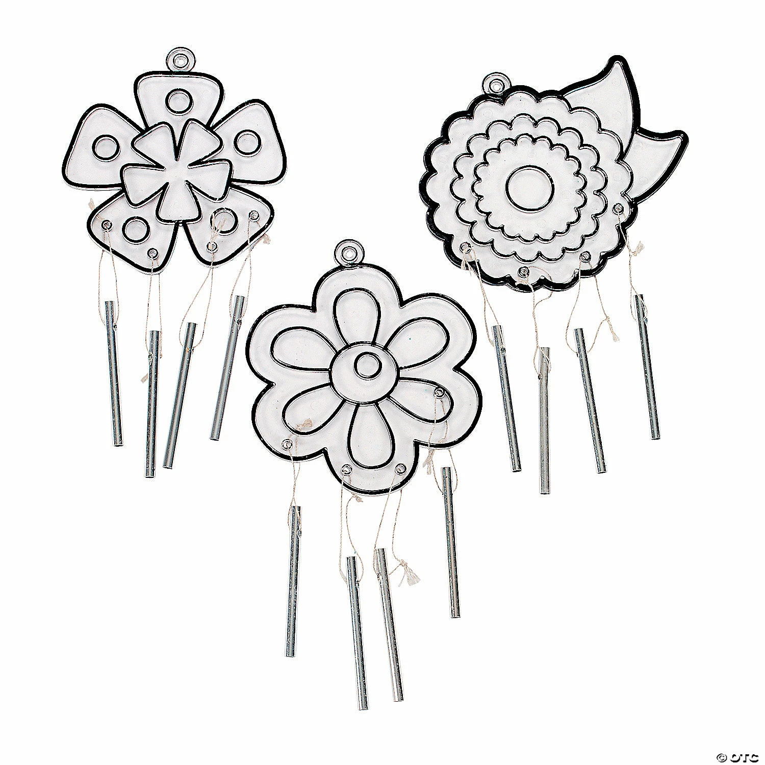 Flower Suncatcher Wind Chimes. Includes 4 each of 3 flower designs. Plastic with metal chimes. Approx. 8″. Paint not included. Hangers not included. ยฉ OTC