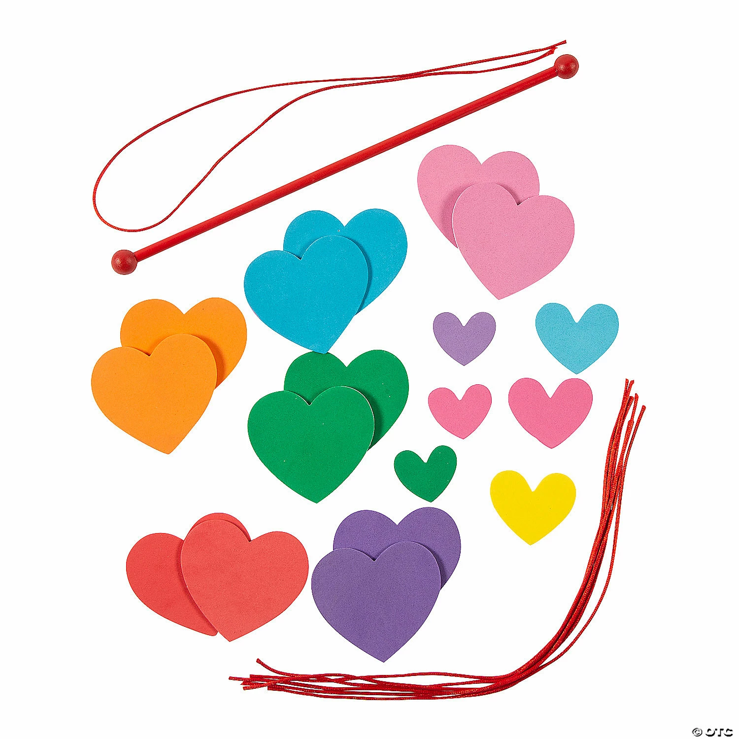 Kids can create their own Valentineβs Day decoration that theyβll be proud to display with this simple and fun craft kit. With enough materials to create up to six adorable hanging hearts mobiles, this craft kit is a great choice for a Valentineβs Day craft activity in the classroom or at home. Be sure to check out all our fun and simple Valentineβs Day crafts on this website! Includes self-adhesive foam pieces, wood dowel and satin cording. 12″ x 19 3/4″ Makes 6. All craft kit pieces are pre-packaged for individual use. Kit includes instructions. Β© OTCRainbow Hanging Heart Mobile Instructions